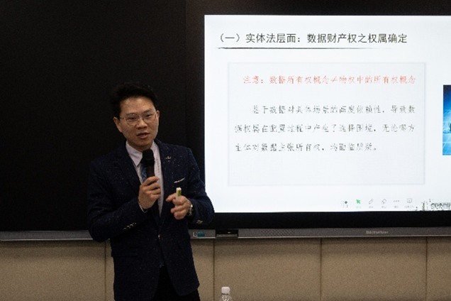 2025年11月2日下午,由研究生院主办、法学院承办的第548期中国海洋大学百川讲坛在法学院一楼105-7智慧教室成功举办。文澜青年学者、中南财经政法大学陈爱飞教授应邀作题为“数据财产的强制执行”的讲座。讲座由中国海洋大学法学院宋春龙副教授主持,法学也本科生及科研究生参加。